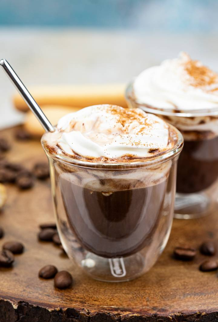 Sterk chocoladeachtige Beierse koffie, een heerlijke drank voor elke koffie- en chocoladeliefhebber! Met slagroom en kaneel.